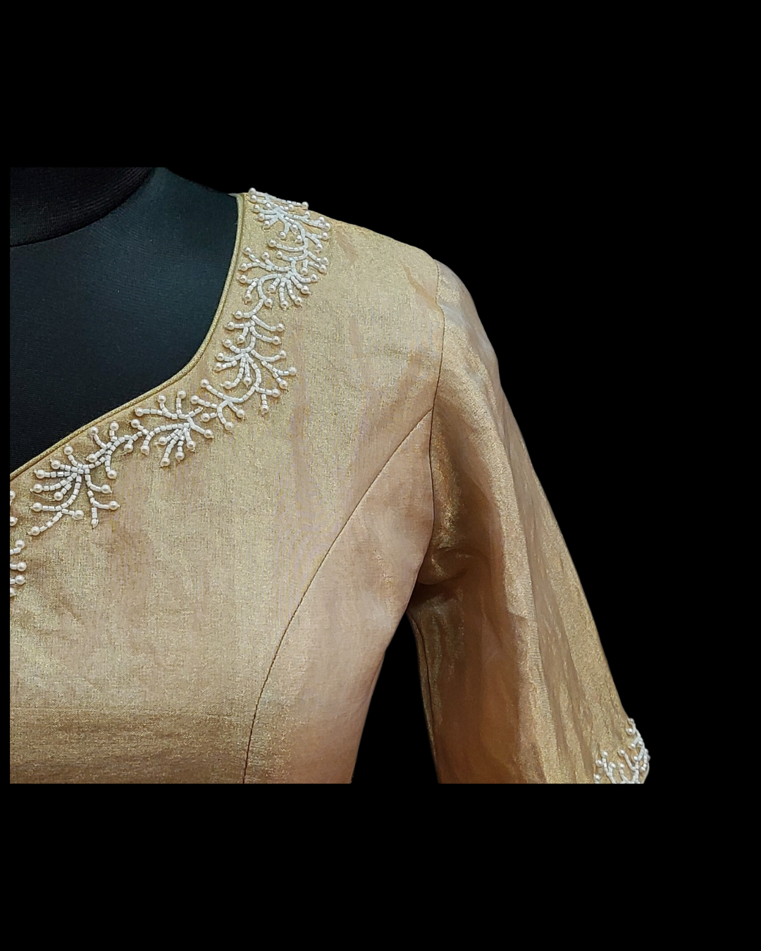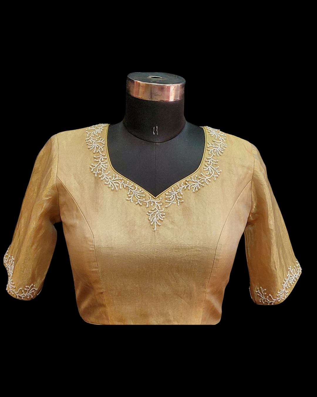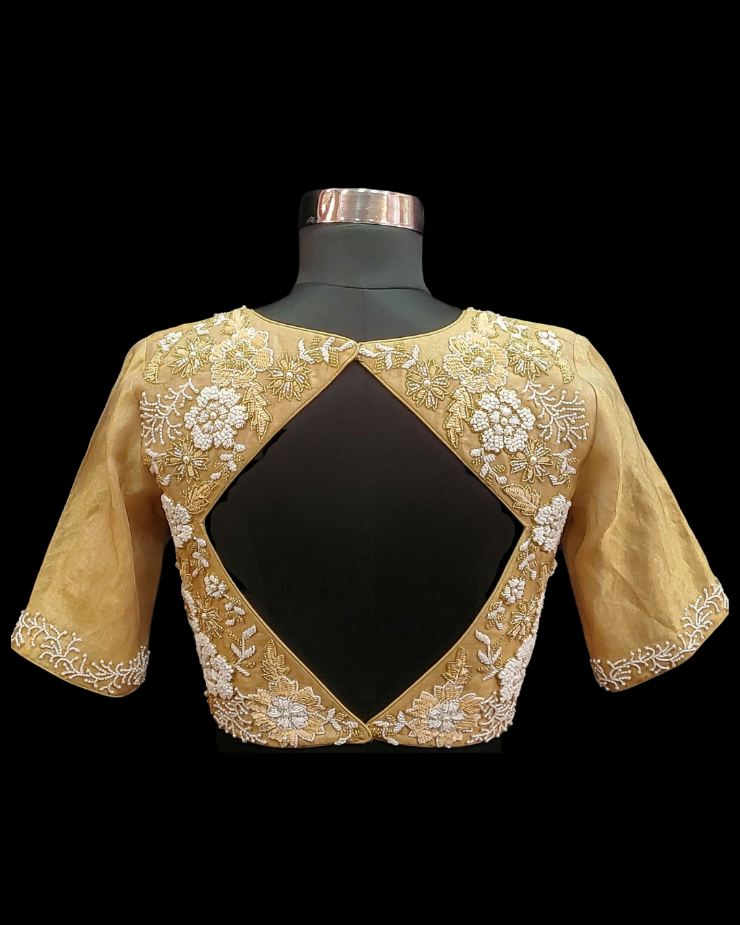 This blouse is a must have for your festive wardrobe as it is made of premium pure tissue chanderi. Further embellishments includes hand embroidery on back and sleeves.