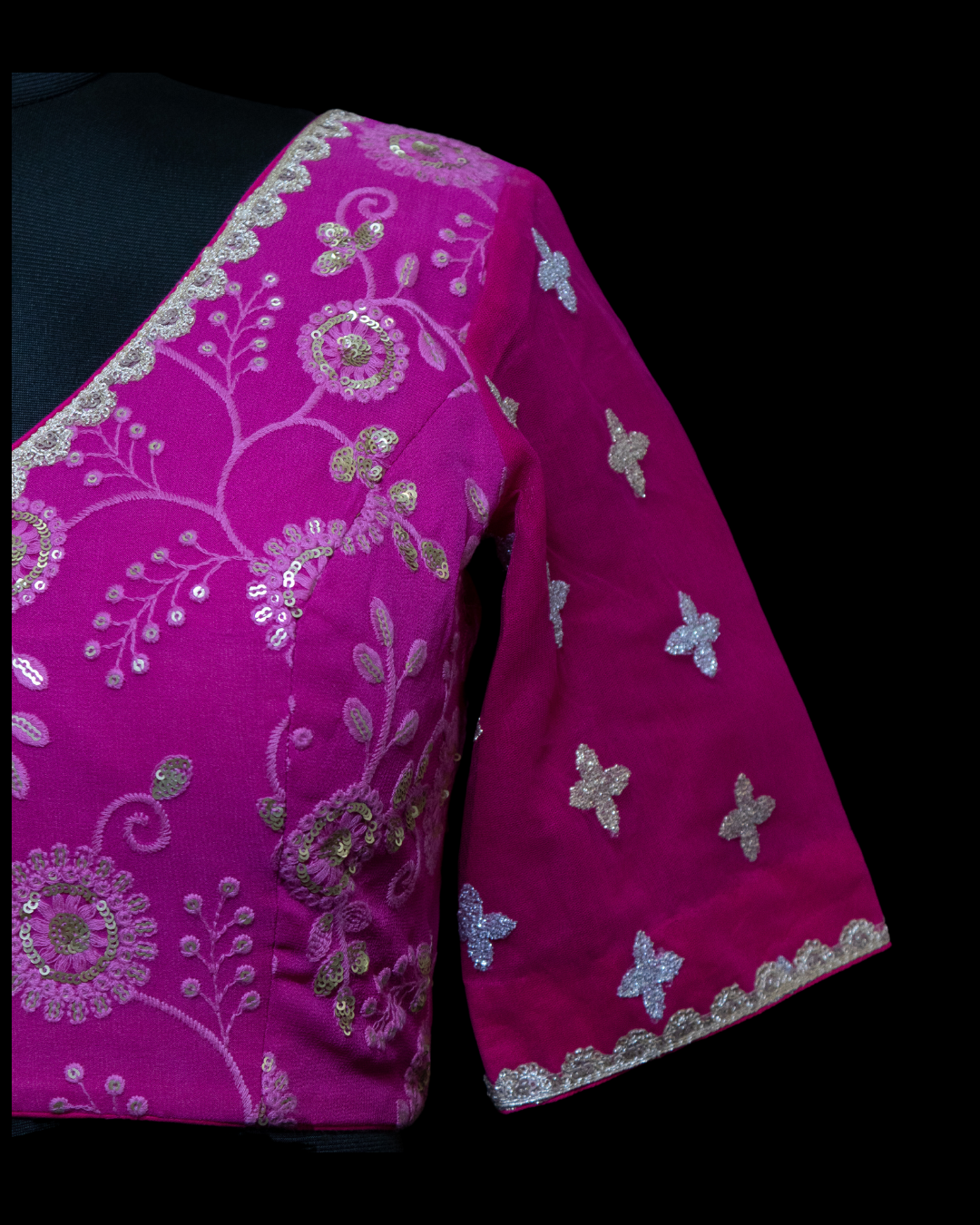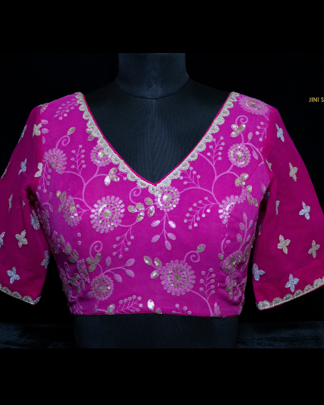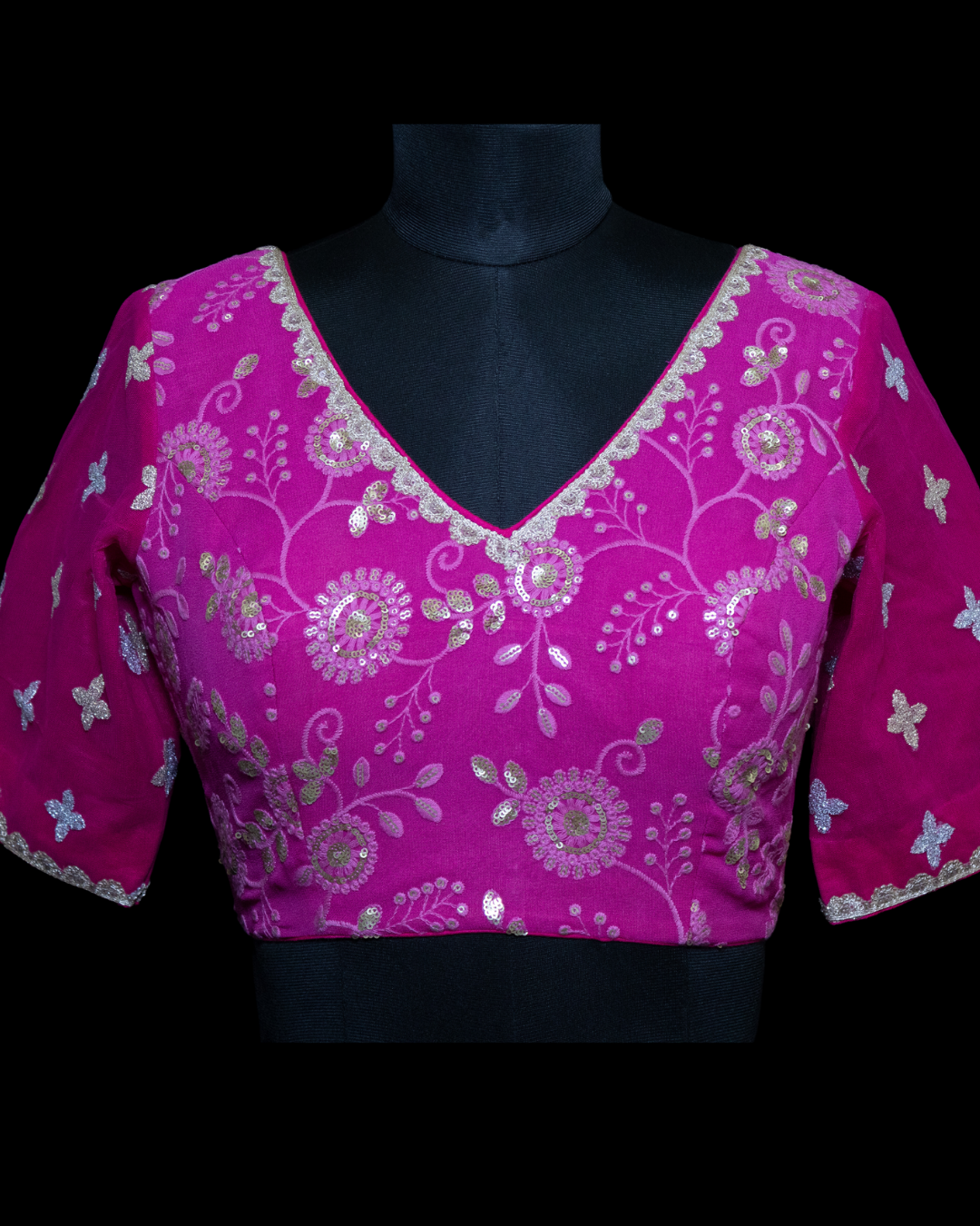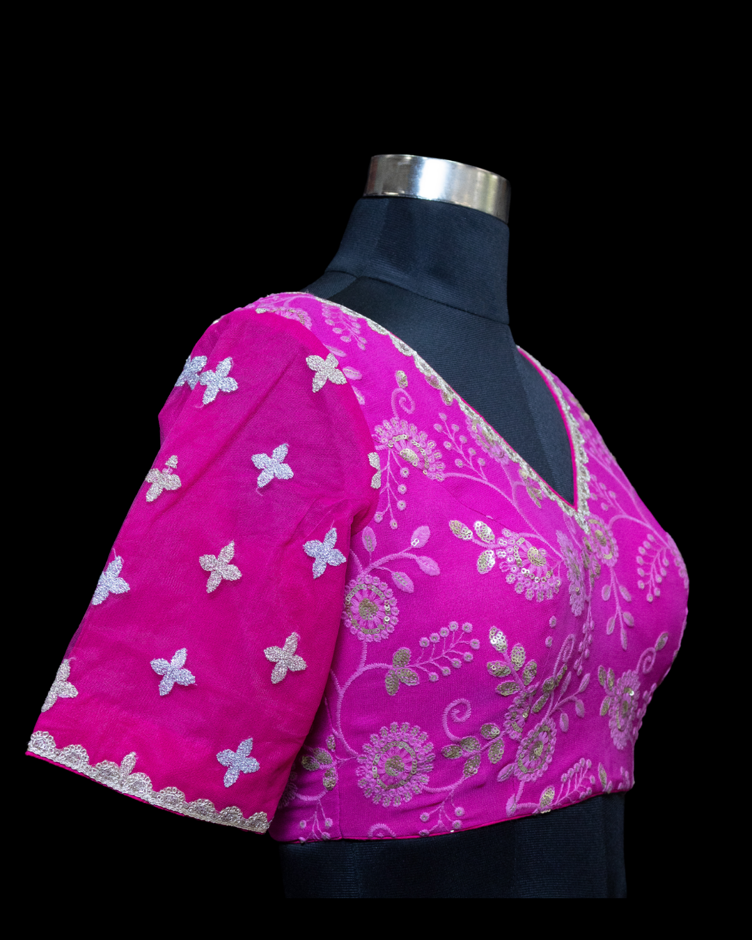 This blouse must have for your festive wordrobe as it is made of machine embroidery Georgette.Further emblishment includes an attractive machine embroidery on body and sleeves